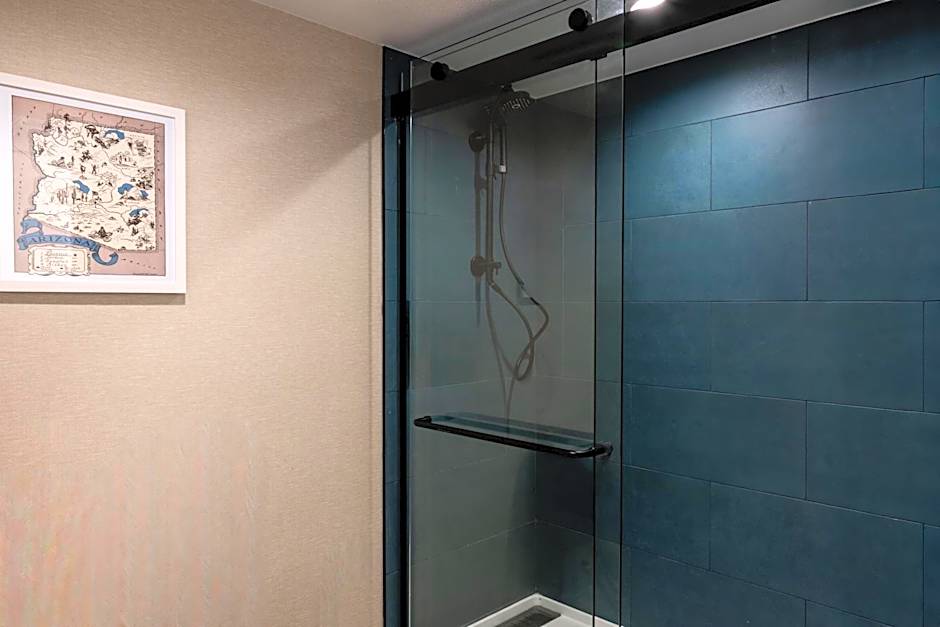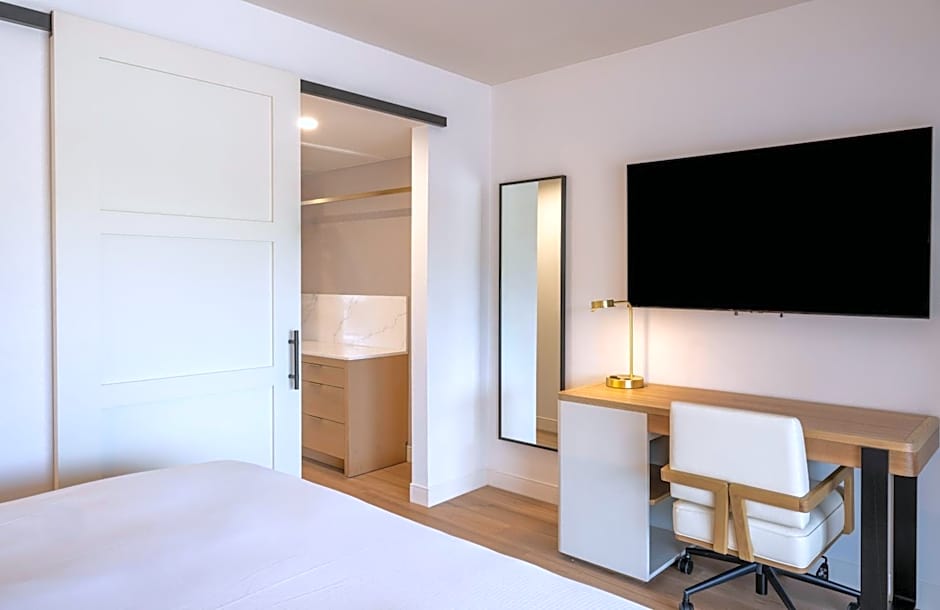 This mobility and hearing accessible suite features visual alarm and notification devices for the doorbell or incoming telephone calls. A living room with a flat-screen TV is also included. An private bathroom with an accessible tub is provided.
